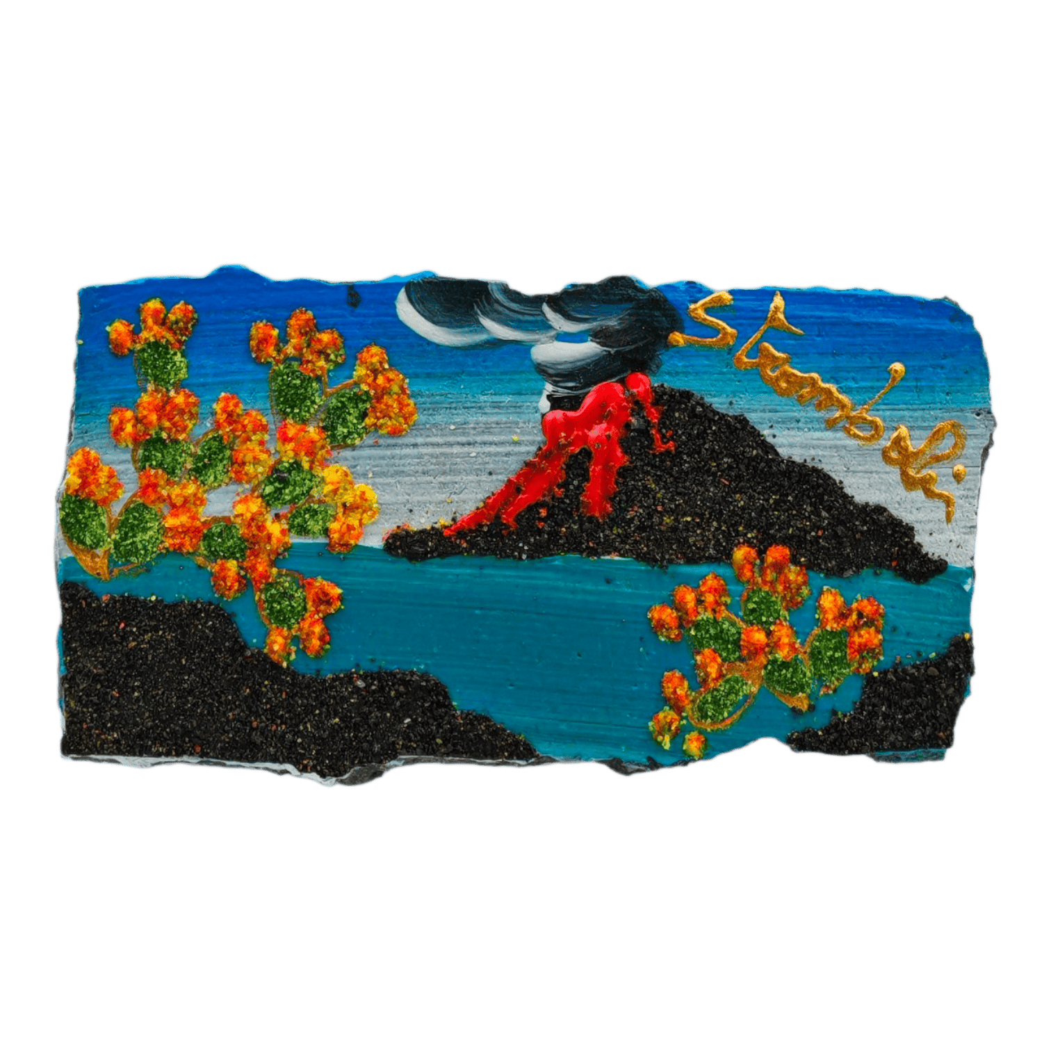 Show moreCalamita da collezione, dipinta in micropittura, soggetto Stromboli, con piante di fichi d'India o Ginestra, tipiche del luogo.