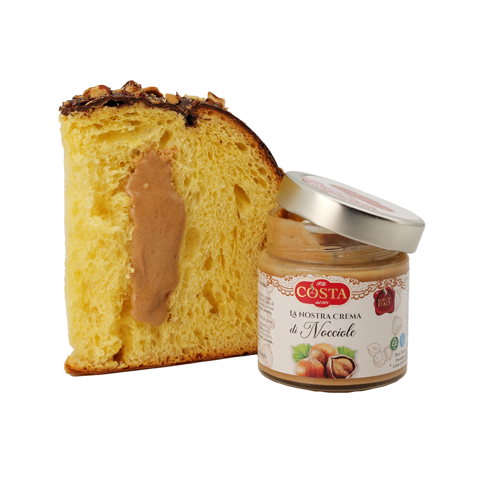 L’impasto soffice e fragrante, senza uvetta né canditi, rimane morbido e profumato, mentre la glassa al cioccolato ricoperta da una favolosa granella nocciole di Sicilia regala sensazioni uniche.