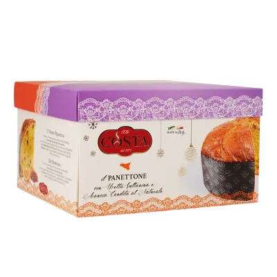 Ingredienti panettone: farina di frumento, zucchero, burro, tuorlo d’uova, lievito naturale (frumento), latte scremato in polvere, emulsionante: mono-digligeridi degli acidi grassi di origine vegetale, sale, aromi.